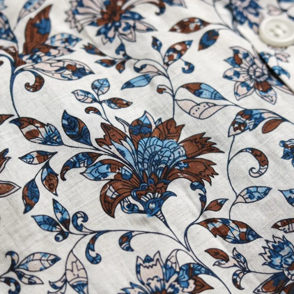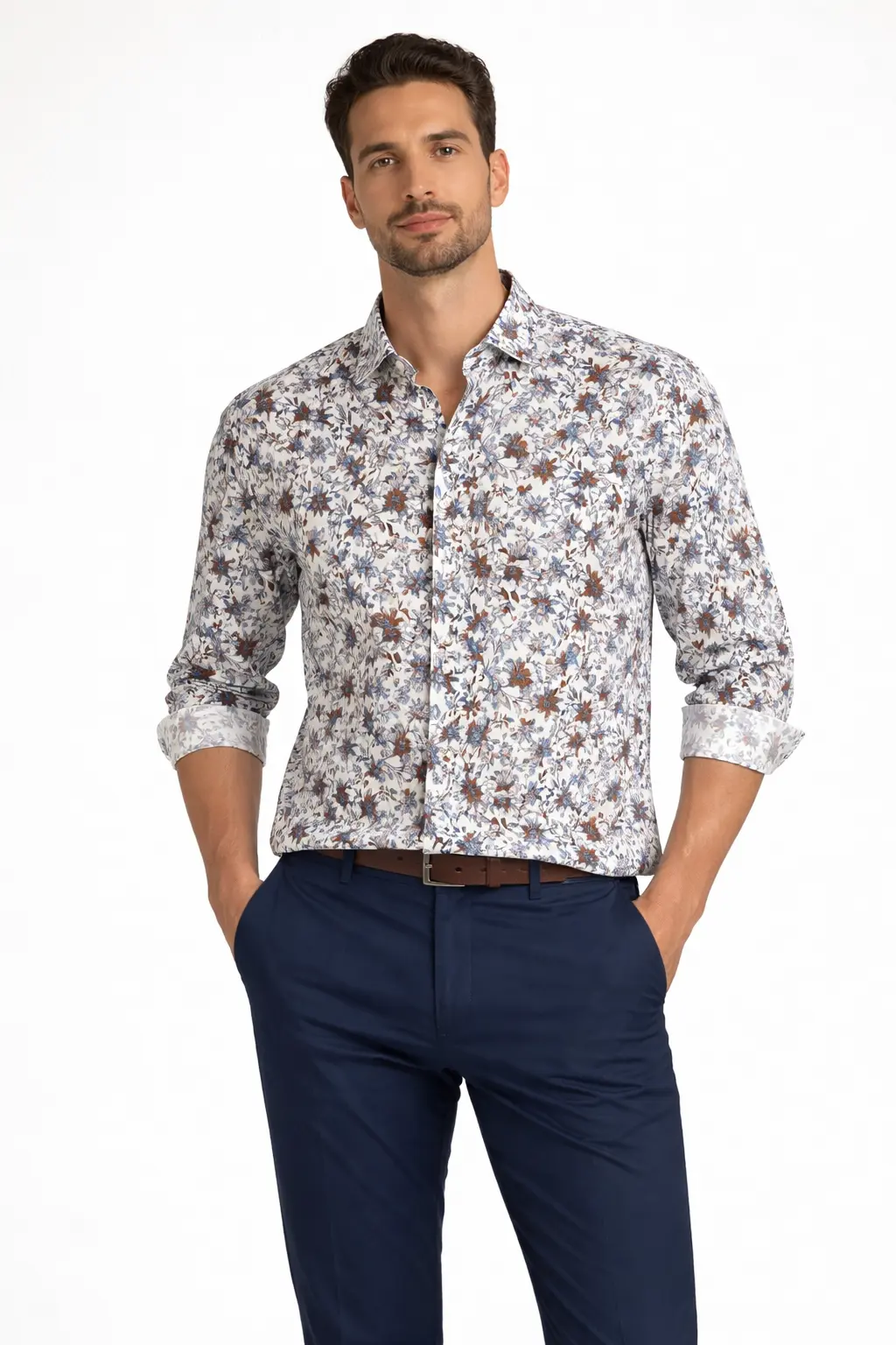 Il design è caratterizzato da una fantasia floreale nei toni del blu e marrone su fondo chiaro, un pattern elegante che dona personalità al capo senza risultare eccessivo. La combinazione cromatica rende la camicia facile da abbinare con diversi capi del guardaroba maschile.