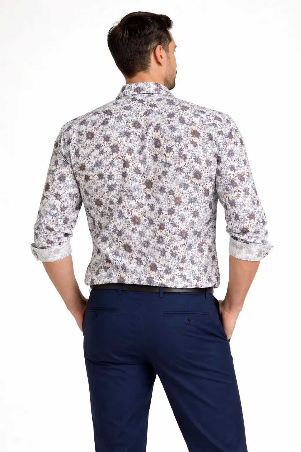 Camicia da uomo ON/OFF con fantasia floreale nei toni blu e marrone su fondo chiaro. Tessuto leggero, colletto classico e vestibilità moderna.
