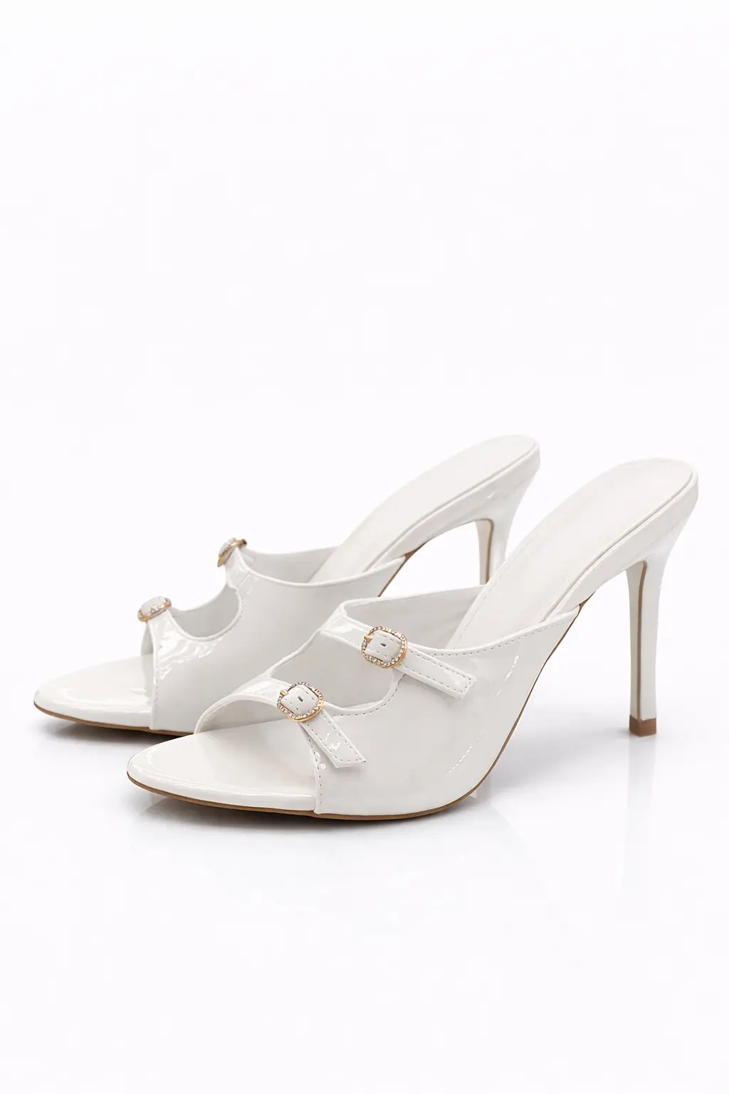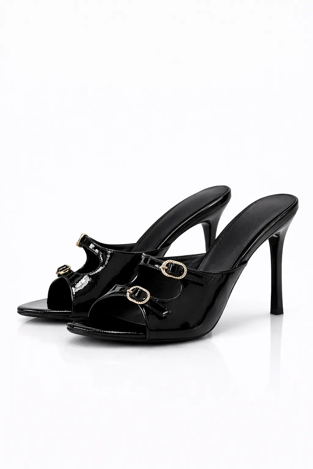 Sandali mule eleganti con tacco alto, punta aperta e fibbie decorative. Modello raffinato disponibile in diversi colori.