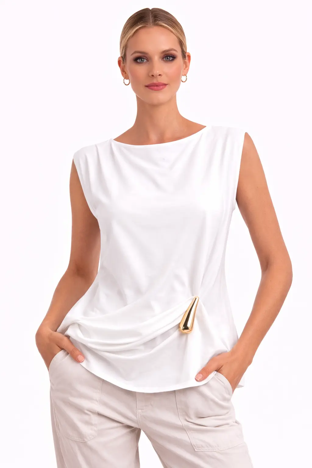 Il top donna maGAmà è un capo elegante e moderno perfetto per creare outfit femminili raffinati. Realizzato in 69% viscosa, 24% nylon e 7% elastane, offre morbidezza, elasticità e comfort. Il design minimal con dettaglio decorativo laterale dona un tocco sofisticato rendendo questo capo ideale sia per look eleganti sia per outfit casual chic. Perfetto da abbinare a pantaloni eleganti o jeans per uno stile moderno e versatile.DETTAGLI PRODOTTO